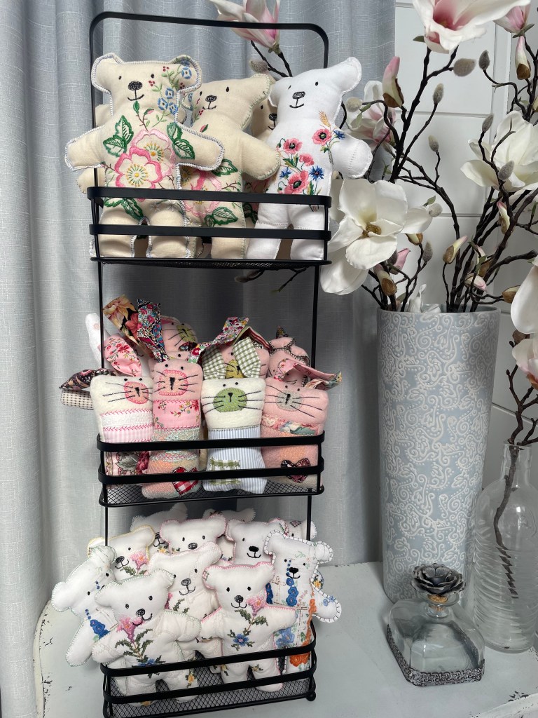 Cute and inexpensive bears and bunnies and ‘giblets’ made from vintage fabric finds.