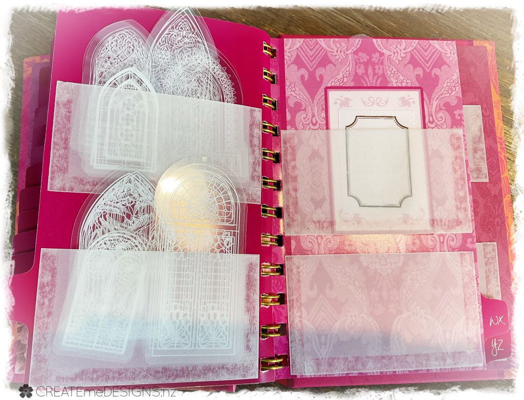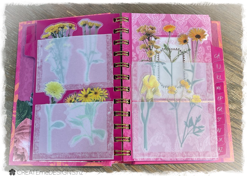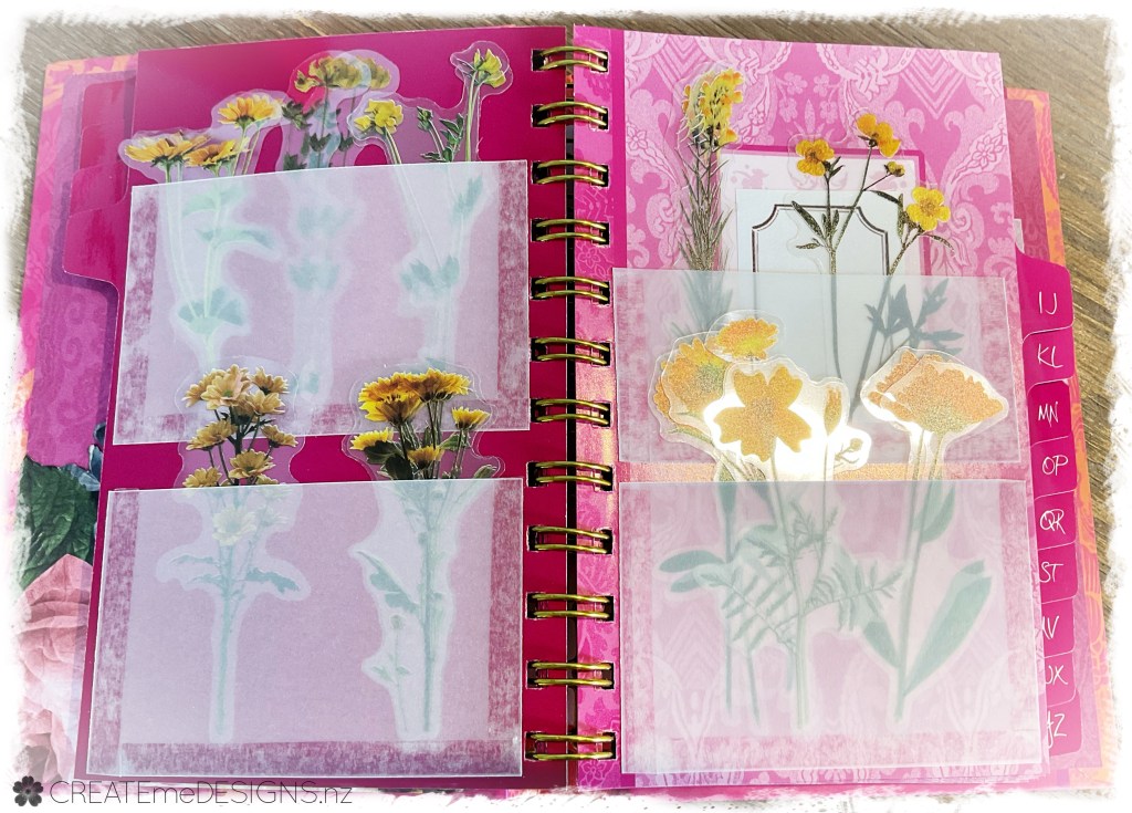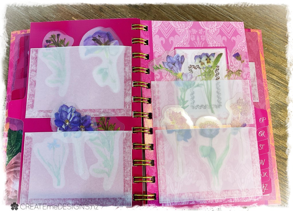 I ordered a whole lot of pretty stickers from AliExpress … and then had to have something to put them in so I grabbed an address book I had purchased from a second hand shop, ripped out the pages and then used the index tabs to stick on some vellum. Covered the back and front with one of my printables I had made from Public Domain pictures (from Rawpixel.com).