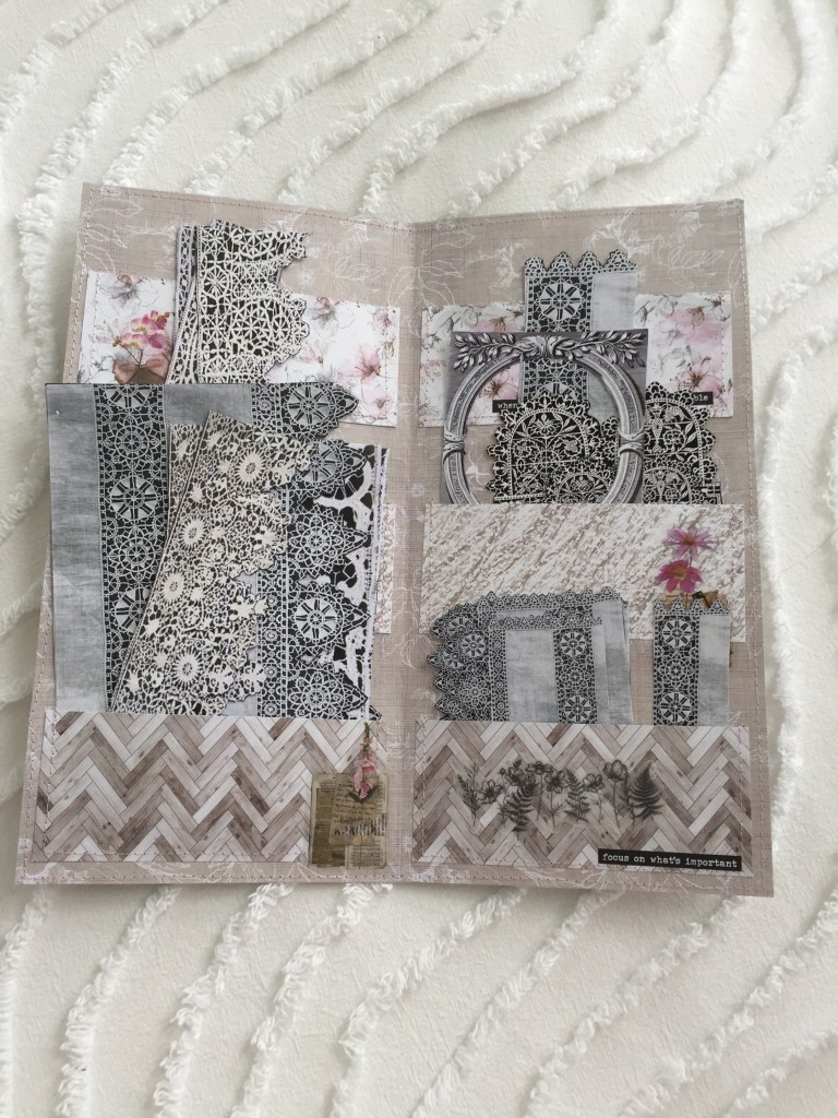 I wasnโt sure what to put in the folder, but I wanted something that complimented it. Then I came across my lace paper cut outs. Perfect.