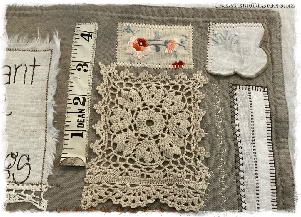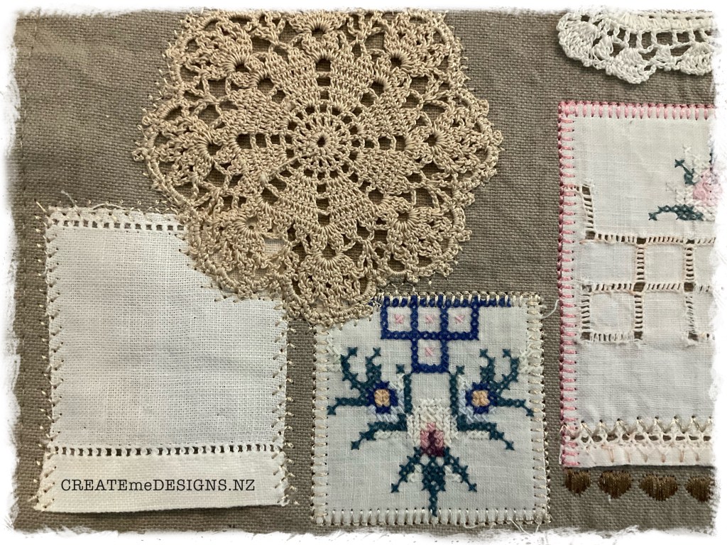 Using a pre-loved place mat as a base I built this simple design using preloved dollies and lace found at options.